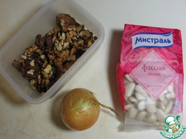 Для приготовления супа нам понадобится действительно немного ингридиентов: фасоль (торговой марки Мистраль, я взяла белую), грецкие орехи, лук, растительное масло, соль, черный перец и зелень петрушки.