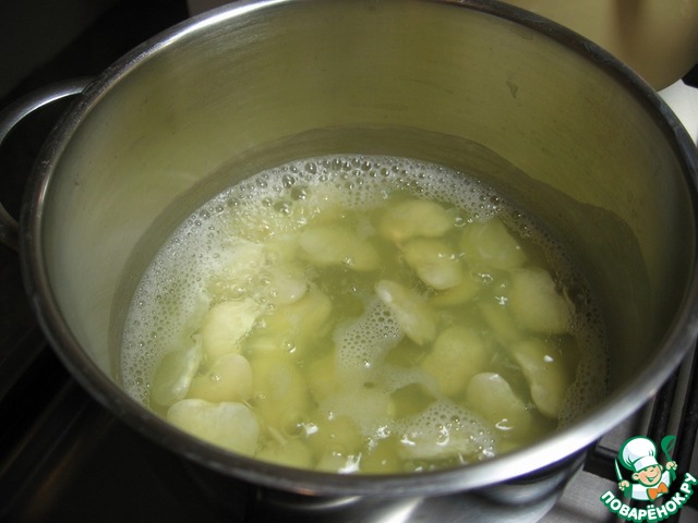 Начнем приготовление с того, что сварим фасоль. Сначала замочим ее в холодной воде, потом в ней же и поставим вариться.