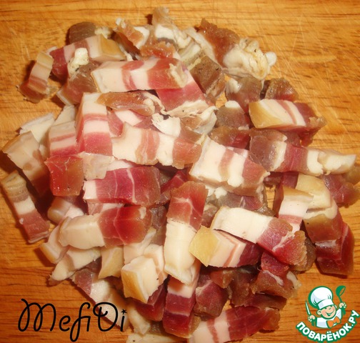 Режeм брусочками грудинку соленую. Заливаем 1,5 л воды. Ставим на огонь. Варим 1 час.