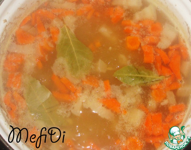 Через полчаса добавляем морковь (режeм произвольно) и лавровый лист.