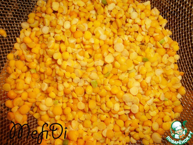 Промываем горох проточной теплой водой. Даем просохнуть на дуршлаге.