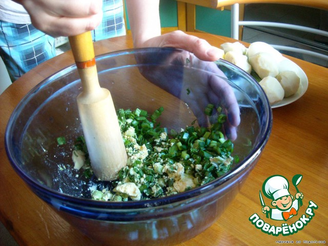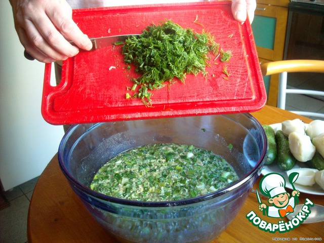 Я однажды видела в телепрограмме, как готовил окрошку один повар и с тех пор начинаю только так. Зеленый лук нарезать и положить в ту посуду, в которой будете готовить окрошку. Туда же - желтки из вареных яиц и горчицу.