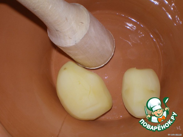Холодный отварной картофель измельчаем (я предпочитаю пюре). Эти два ингредиента смешиваем и оставляем минут на 40-50. (На этом окрошка по-вятски заканчивается: добавить резанный огурец, зелень, квас и хрен).