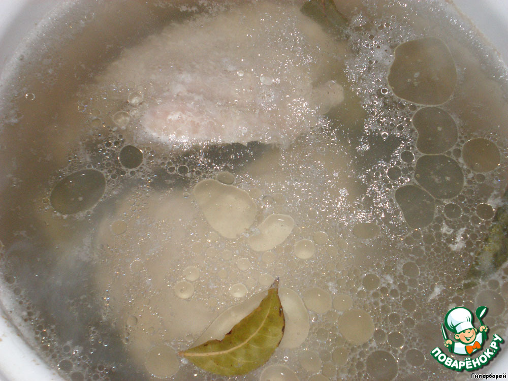 Берем два бедрышка, заливаем водой, добавляем лаврушку, 3 зубчика чеснока и ставим варить на медленном огне (не забывать собирать пену).