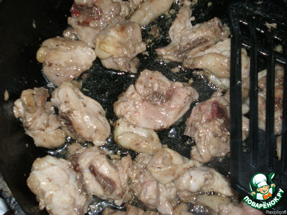 Берем еще 2 бедрышка и нарезаем небольшими кусочками. Кладем поджаривать в хорошо разогретую сковороду с растительным маслом.