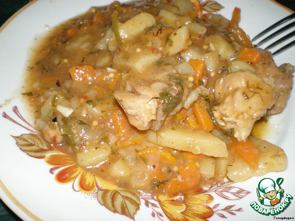 Обжаренные бедрышки отправляем в глубокую посуду для тушения. В сковороду добавляем немного растительного масла и обжариваем нарезанный картофель. Затем перекладываем его в посуду для тушения, добавляем еще немного масла в сковороду и зернышки горчицы. Теперь обжариваем морковь и репчатый лук. Как только зажарка готова, выкладываем ее на картофель в посуду для тушения и заливаем водой. Содержимое перемешиваем, накрываем