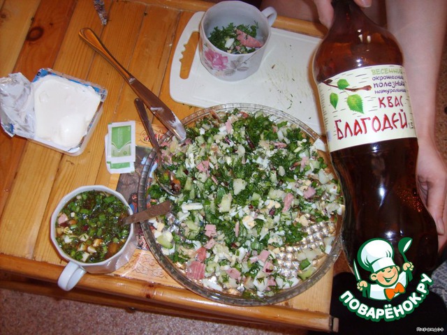 В общем все же окрошку готовить умеют, просто всё порезать, залить квасом, посолить, поперчить, и сметанки добавить. Вкууууснотищща!!!!! (Особенно после 15 дней "домашней голодовки")))))))).