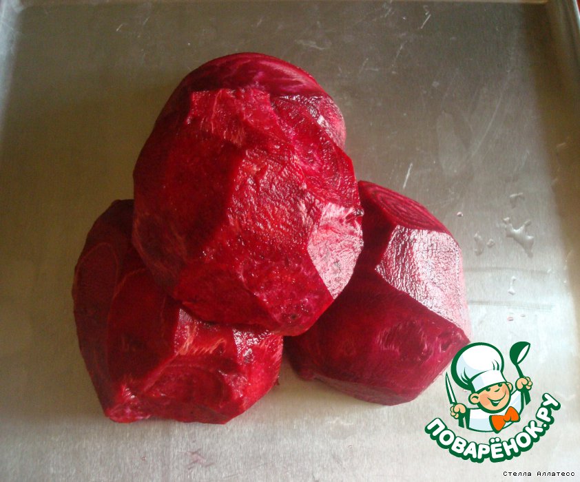Свеклу очистить и вымыть. Залить водой, поставить на огонь и варить до готовности свеклы. Затем добавить одну столовую ложку 9 % уксуса (для цвета), довести до кипения и выключить. Остудить. Свеклу вынуть.