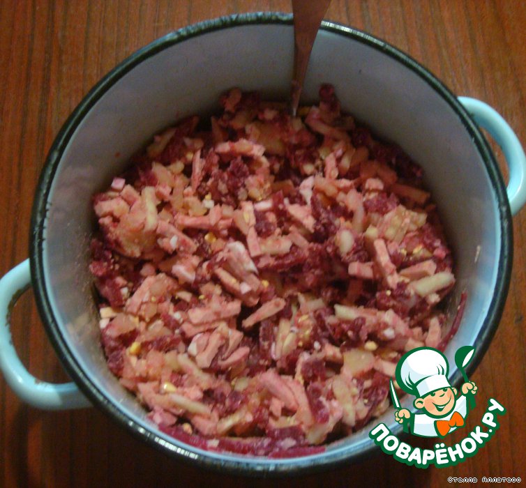 Свеклу очистить, вымыть и натереть на терке. Залить водой, поставить на огонь и довести до кипения. Добавить одну столовую ложку 9 % уксуса (для цвета), еще раз довести до кипения и выключить. Остудить. Свеклу выкинуть.