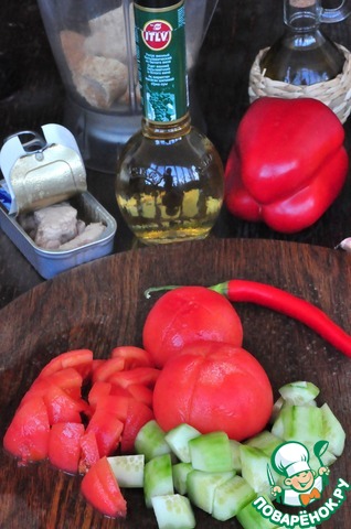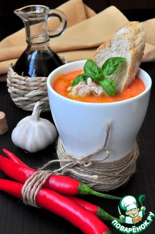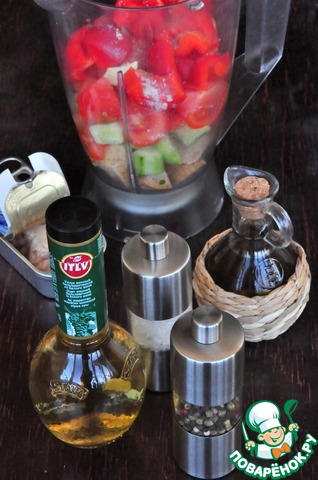 Порезать овощи крупно, переложить в бдендер, добавить хлеб с лимонным соком, чеснок, морскую соль, перец черный молотый, оливковое масло и бальзамичексий укус. Добавить чили свежий по вкусу.