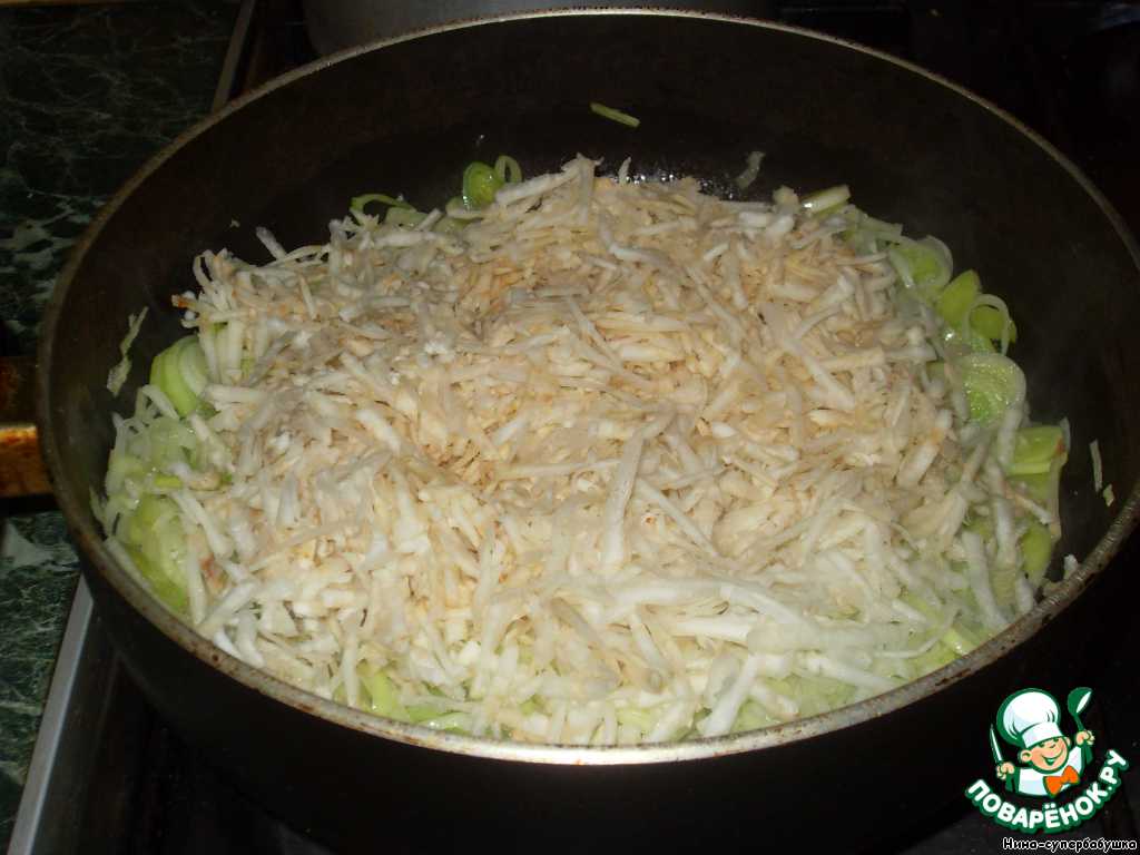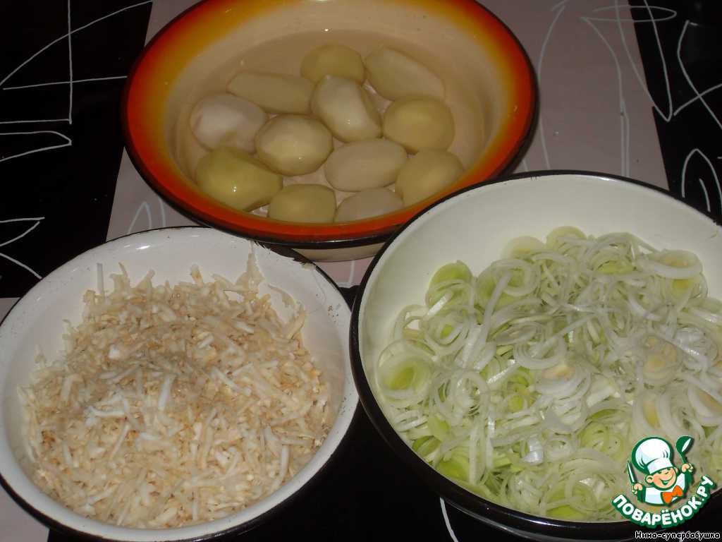 Лук-порей нарезать колечками. Сельдерей очистить и натереть на крупной терке. Картофель очистить и нарезать небольшими кубиками.