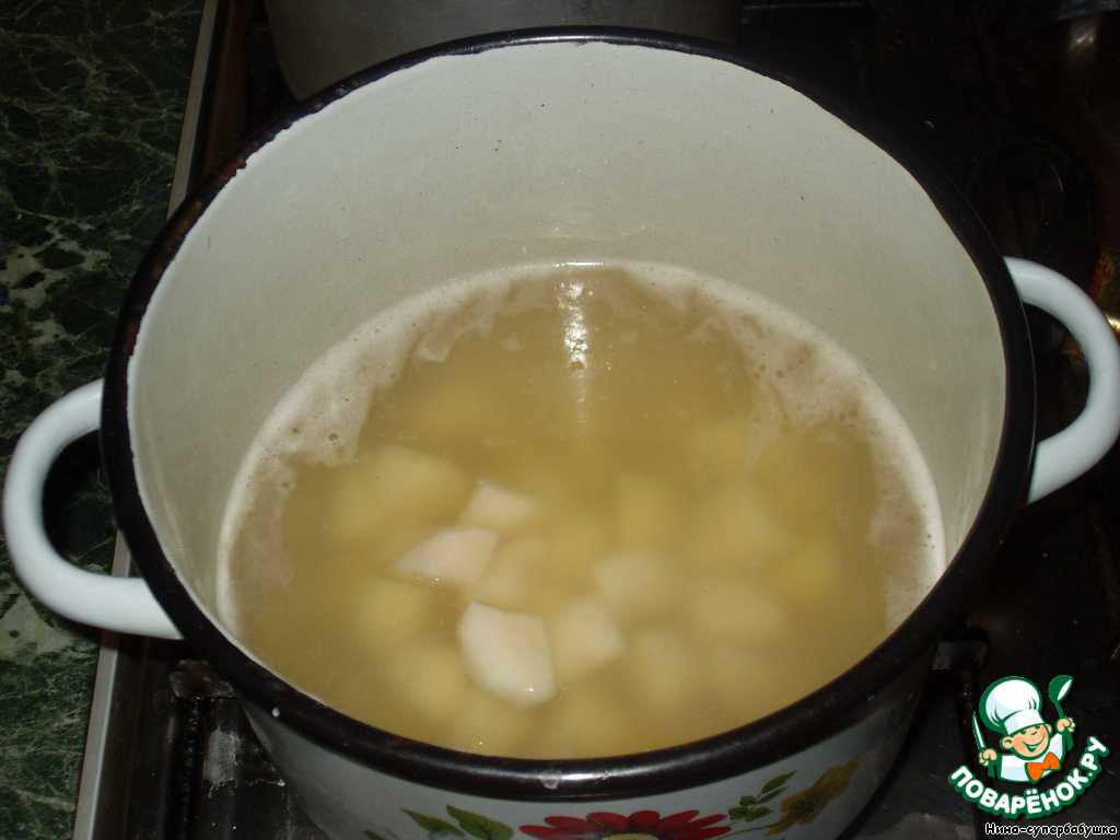 В горячий бульон, налитый в кастрюлю, положить картофель и довести до кипения.