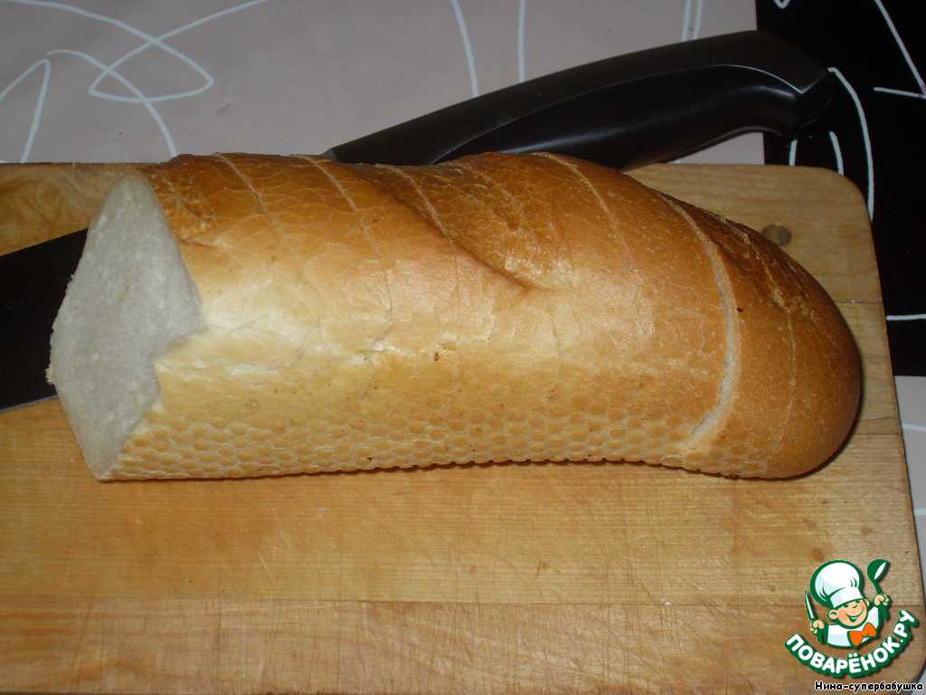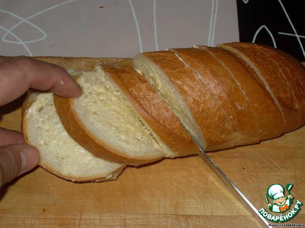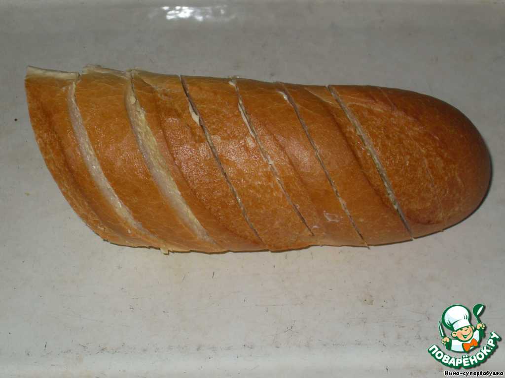 В это время приготовить чесночные гренки. Багет разрезать наискосок на тонкие ломтики, не дорезая до конца.