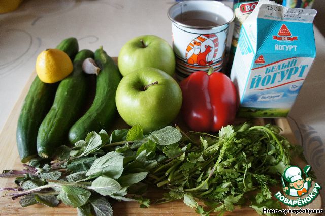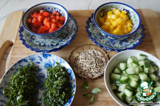 Незадолго до подачи нарезать перец и отложенный огурец маленькими кубиками, измельчить мяту и кинзу. Все перемешать.
