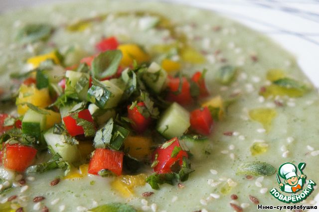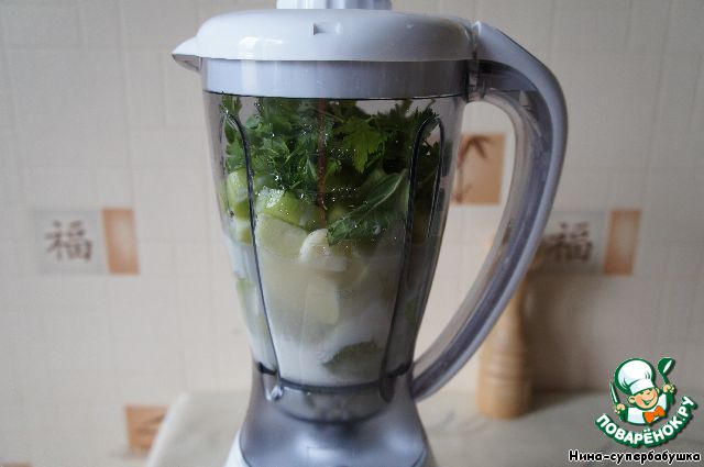 | Вообще-то этот суп называется "Зеленый гаспачо", но я решила его переименовать. По аналогии. Раз уж у меня есть "золотой гаспачо", почему бы не появиться "изумрудному"?!! А вкус у него совершенно необыкновенный... удивительное сочетание огурцов, яблока и легкое, почти неуловимое, послевкусие чеснока... Попробуйте, это необыкновенно вкусно))) |