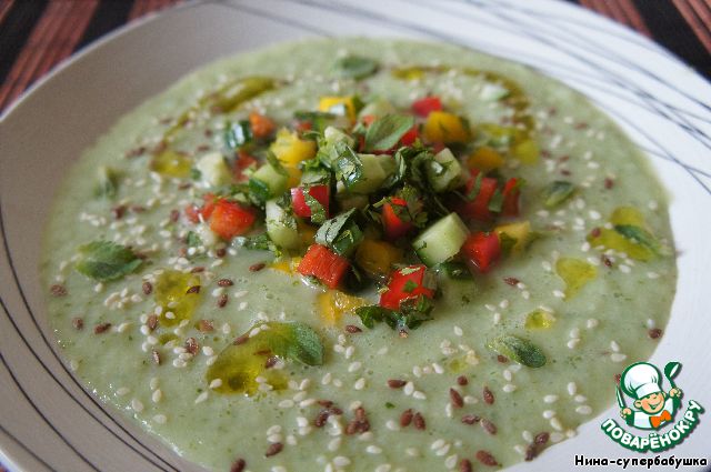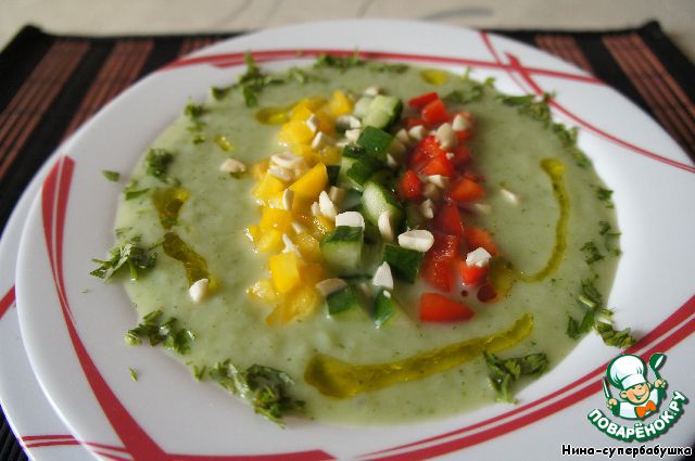 В охлажденные тарелки налить суп, добавить гарнир, полить небольшим количеством оливкового масла и посыпать орешками или кунжутом по вкусу.