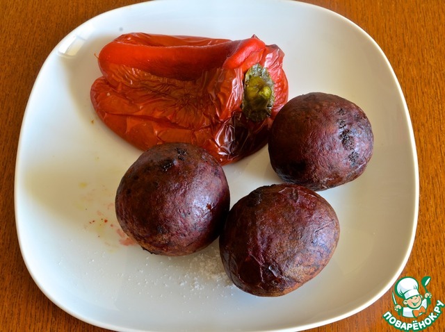 2. Через сорок минут после того как свекла отправилась готовиться в духовку, отправить туда и перец. Через 10 минут перевернуть его и запекать еще 10 минут. Готовые овощи очистить.