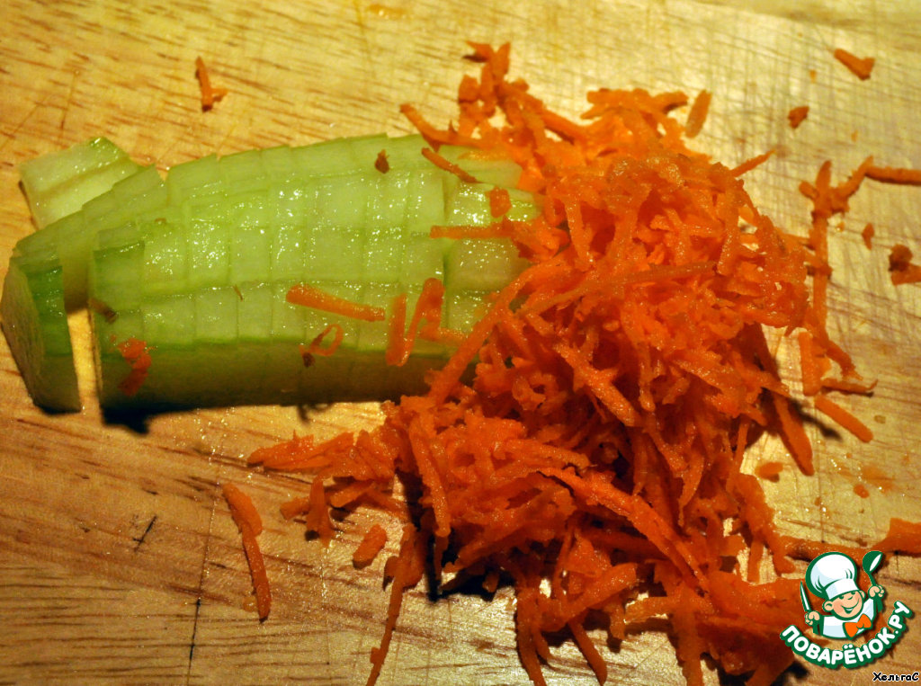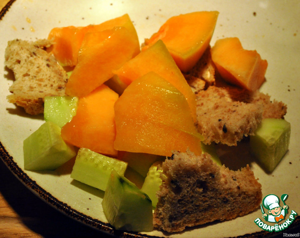 Дыню и огурец режем мелко, хлеб измельчаем.