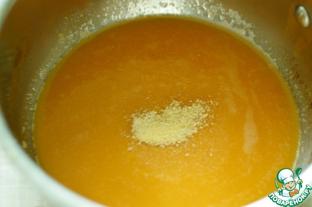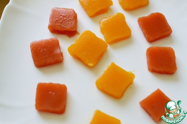 2. Когда желатин растворится, разлить томатную смесь в формочки, или большую форму, застеленную пищевой пленкой, слоем примерно 1 см и убрать в холодильник до полного застывания желе. Затем вынуть желе из форм, или из большой формы и нарезать произвольно.