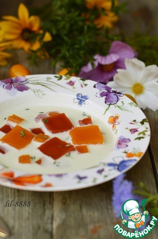 | Очень вкусный, освежающий суп с кусочками разноцветного желе прийдется по вкусу не только вашим близким, но и удивит ваших гостей. Желе можно делать из шпината со сливками, из моркови, тыквы и т. д. |