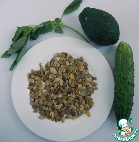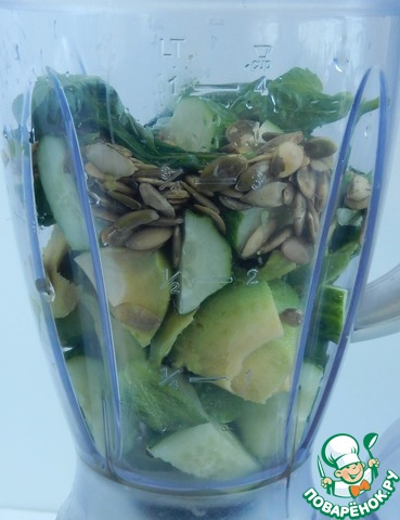 Закладываем в чашу блендора порезанные огурцы, авокадо, тыквенные семена, добавляем чеснок, базилик и лимонный сок. Перемалываем.