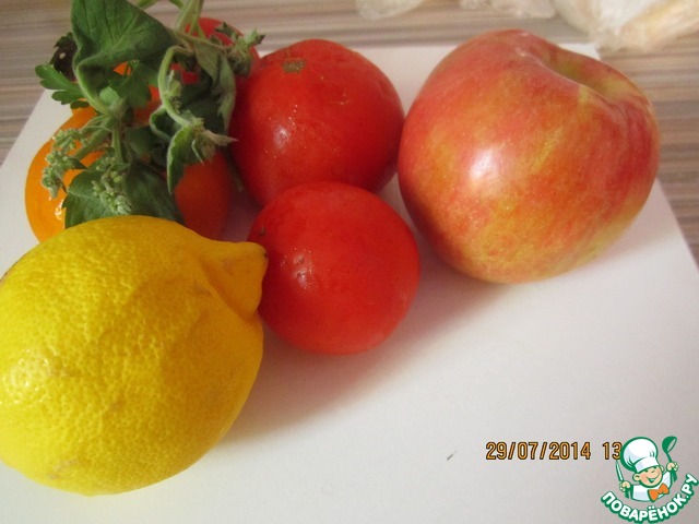 Нам понадобится Яблоки 3шт, помидоры 6шт, лимон 1 шт, 3 пера зеленого лука. Зелень и специи по огромной любви и желанию я обожаю базилик и добавляю его во все блюда, соль, перец, уксус по вкусу. Можно вместо уксуса использовать яблочный сидр.