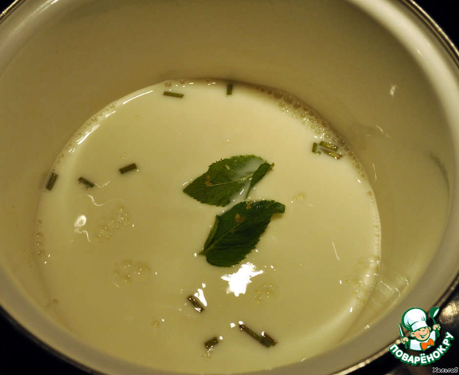 Энергично смешаем йогурт и молоко, а также добавим листочки мяты. Лучше мелко нарезанные, так как аромат быстрее насытит наше блюдо. Отправляем в холодильник, перед заправкой вынем куски мяты, она немного жестковата, но я, например, не вынимаю.