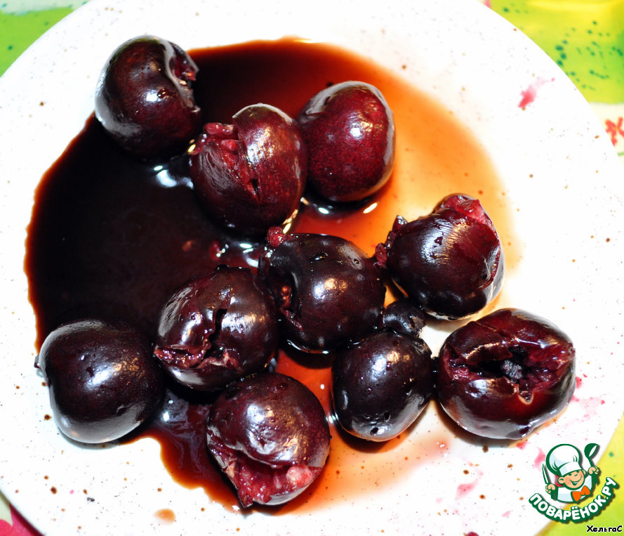Черешню заливаю уксусом бальзамическим, если готовите для детей, то добавьте просто сока. И дадим настояться немного в холодильнике.