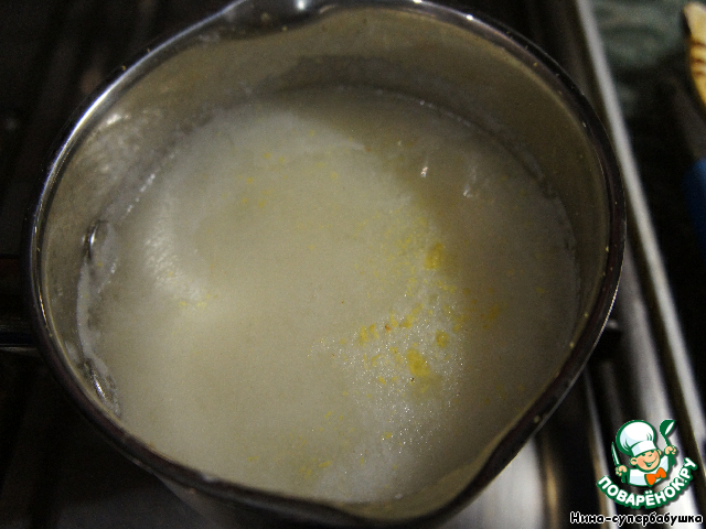 Когда манка будет готова, быстро охладить её до 70*С. Я поставила в таз с холодной водой.