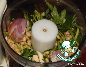 В комбайн уложить зелень петрушки (предварительно ополоснуть её в холодной воде), чеснок, лук, кедровые орешки. Добавить половину растительного масла.