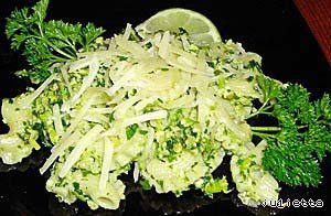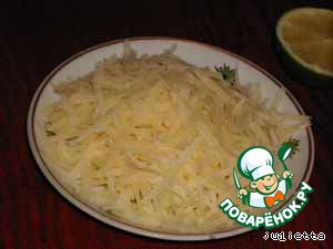 Тем временем натереть тонкой соломкой (или настрогать прозрачными хлопьями) пармезан.