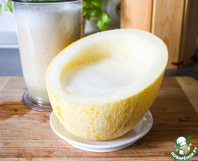 Содержимое блендера перелить в дынные половинки. Теперь их нужно хорошо охладить. Отправить в холодильник на час/два, если нет времени долго охлаждать, то для более быстрого охлаждения и добавляется лед на этапе взбивания.