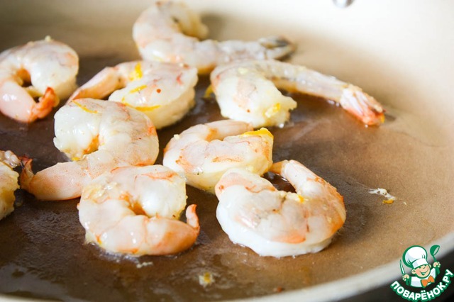 Замариновать креветки в апельсиновом соке (из 1/3 апельсина) с добавлением натертого ранее имбиря, 2ух капель табаско (и или перца-чили) и 1/3 апельсиновой цедры. Накрыть пленкой и оставить мариноваться минут на 20.