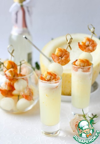 Готовые креветки нанизать на шпажки чередуя с ранее подготовленными дынными шариками. (Для подачи, в идеале -креветки должны быть теплыми).