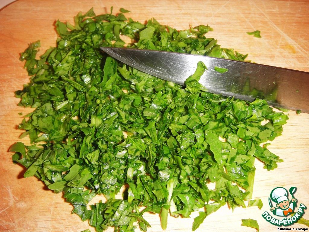 Берём из общего количества небольшую горстку рукколы и мелко рубим ножом. Оставляем в сторонке (мы используем её чуть позже). Всю остальную рукколу оставляем целой.