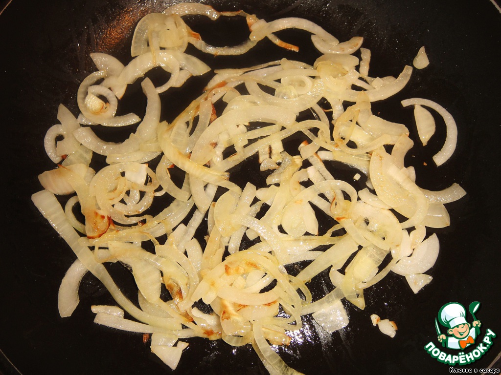 Репчатый лук нарезаем полукольцами и обжариваем до лёгкой золотистости на растительном масле.