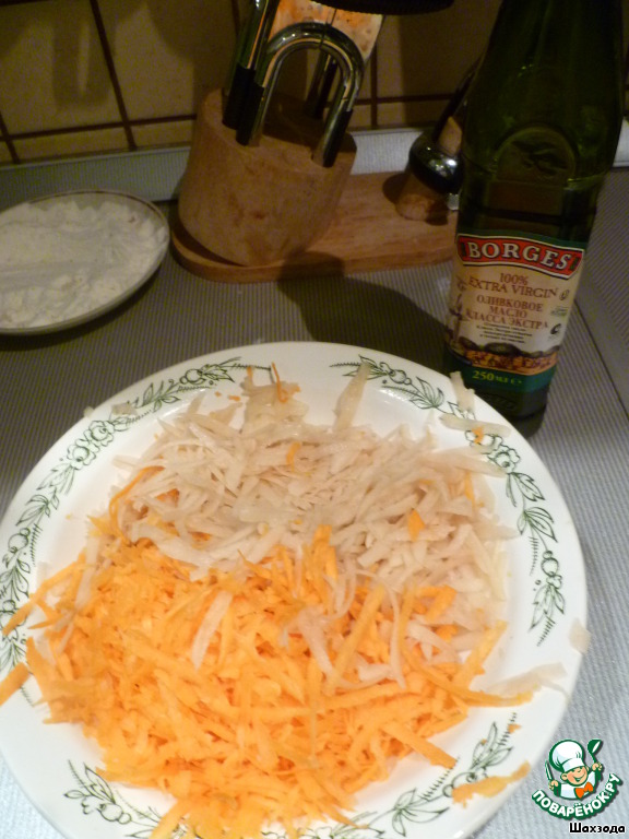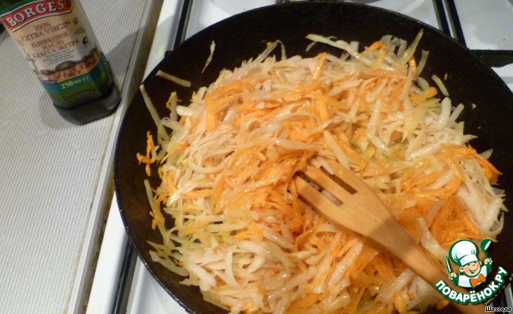 Натертую морковь и картофель спассеровать на оливковом масле при постоянном помешивании (при пассеровке моркови с маслом выделяется бетта-каротин, тот же витамин А, и суп получается по цвету насыщеннее)