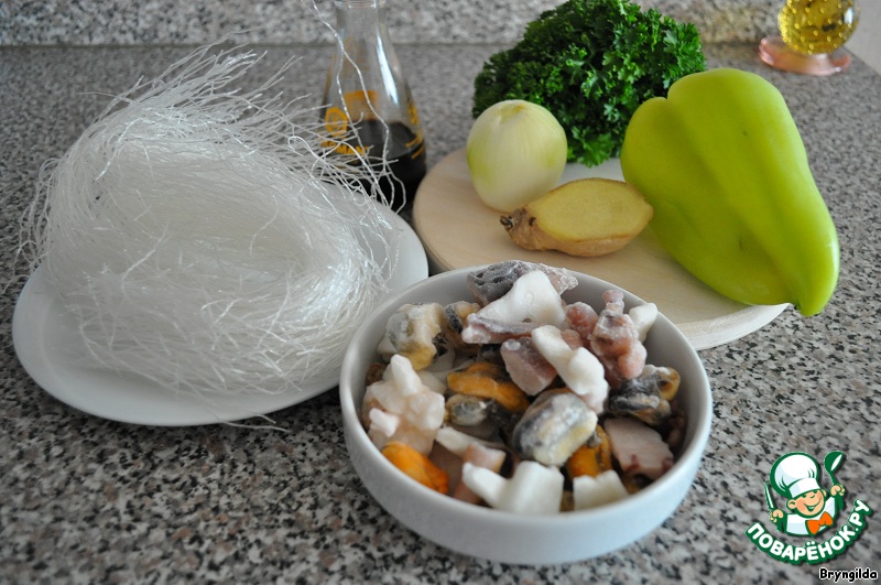 Через 2 минуты загрузим морской коктейль и после закипания сразу выключаем вливаем соевый соус и посыпаем пертрушкой. Сразу же подавать.