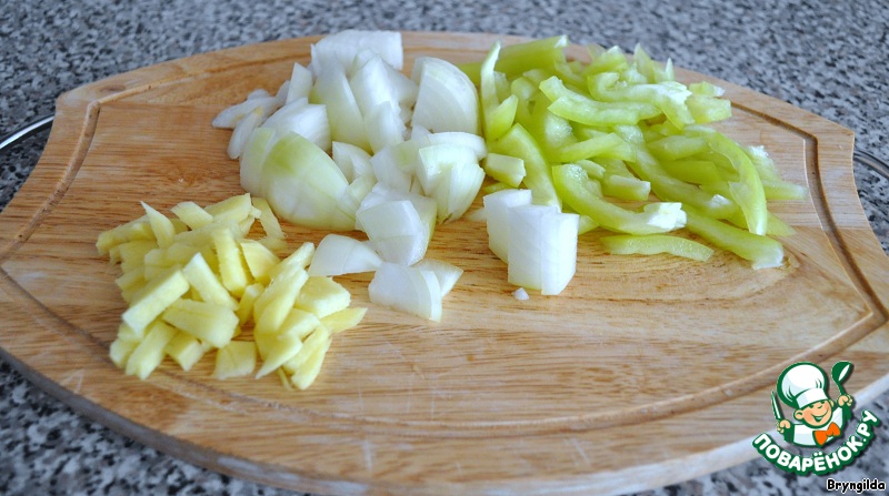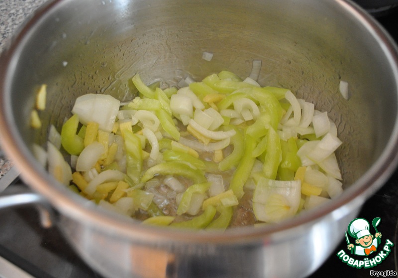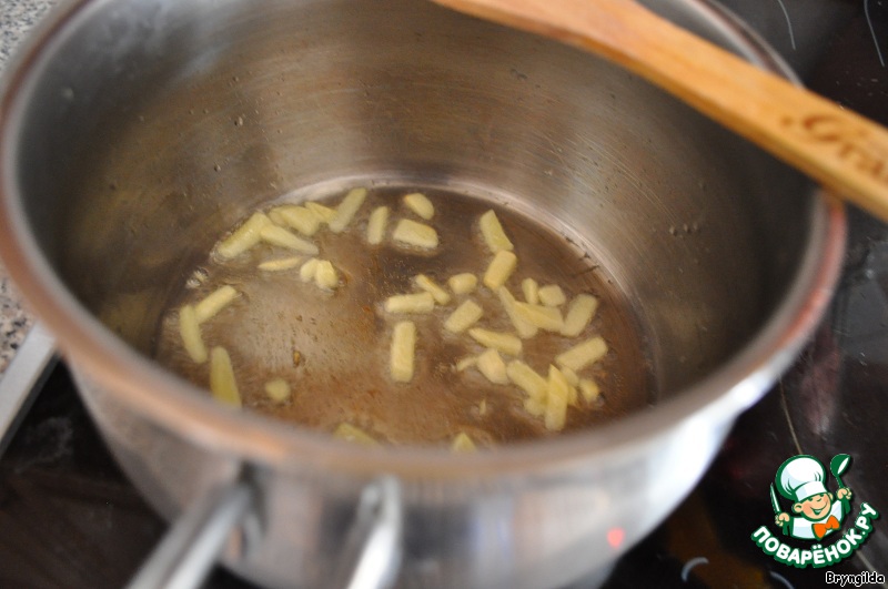 В разогретое оливковое масло бросим имбирь и немного обжарим.