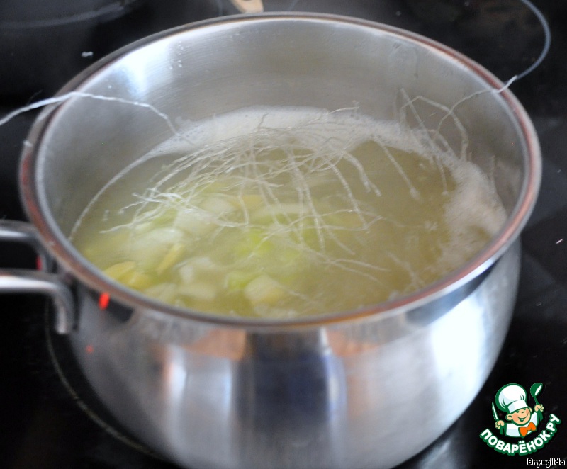 Вольем готовый бульон, как только он закипит, опустим фунчезу и дадим супу закипеть.