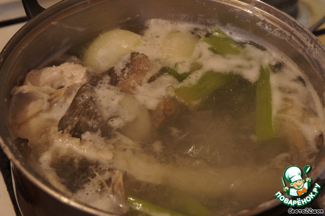 Для начала готовим рыбный бульон: рыбьи плавники, голову, очищенную от жабер, сельдерей и репчатый лук - заливаем литром холодной воды. Ставим на средний огонь, доводим до кипения, снимаем пену, солим по вкусу и продолжаем варить еще 30 мин.