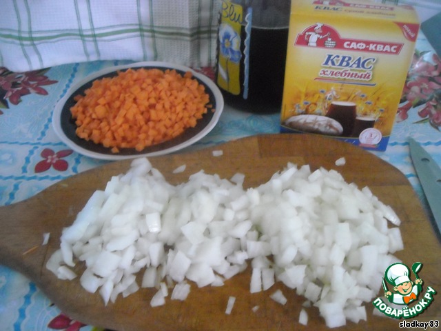Тем временем нарезать морковь и лук мелкими кубиками. Квас вскипятить (саф-квас перед использованием нужно приготовить по рецепту, указанному на упаковке).