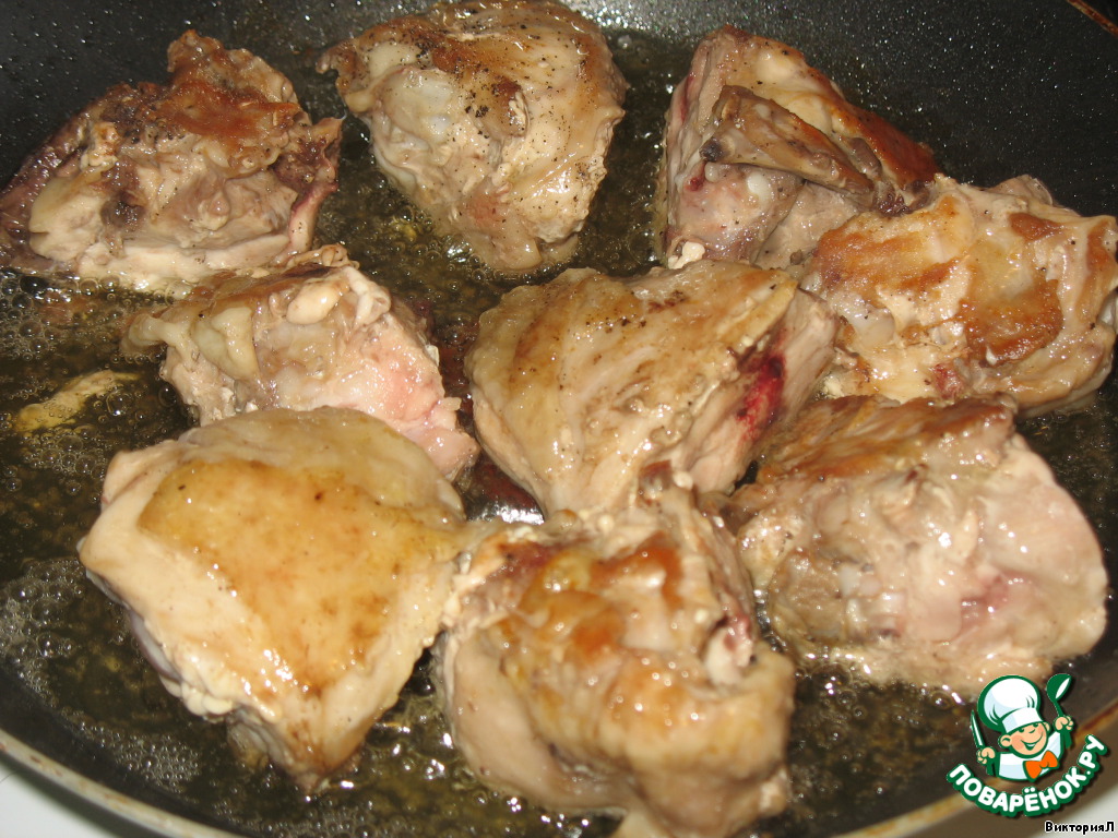 Куриное мясо разрезать на куски и обжарить на топленом масле до золотистого цвета.