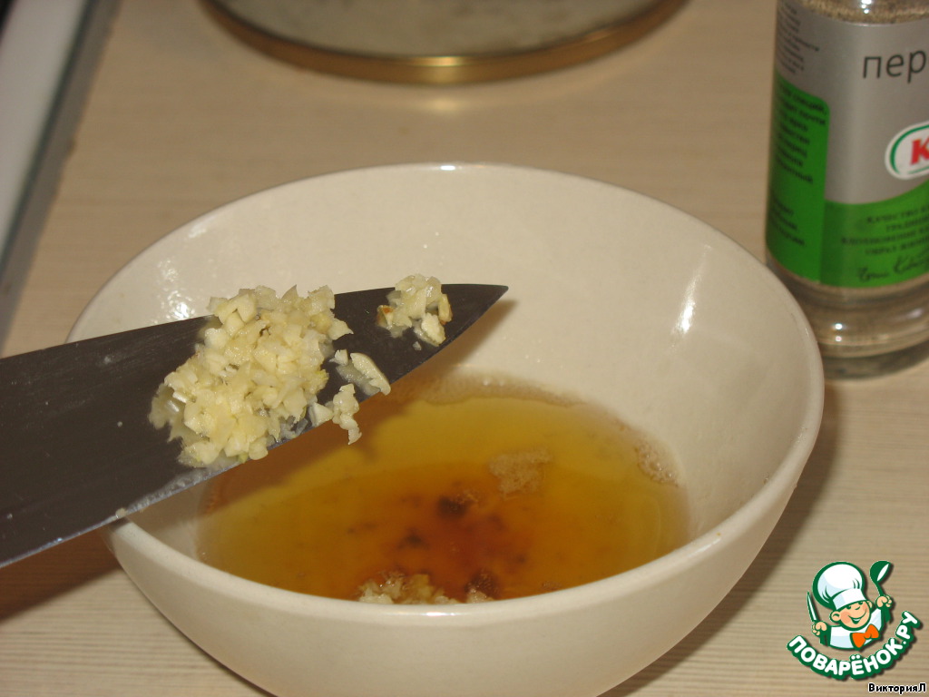 Половину масла отлить в пиалу и добавить к нему измельченный чеснок.