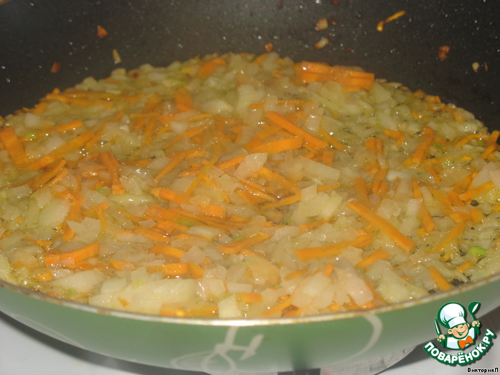 Лук и морковь мелко нарезать и обжарить на сковороде с оставшимся маслом,