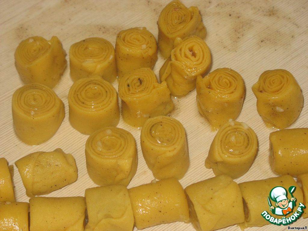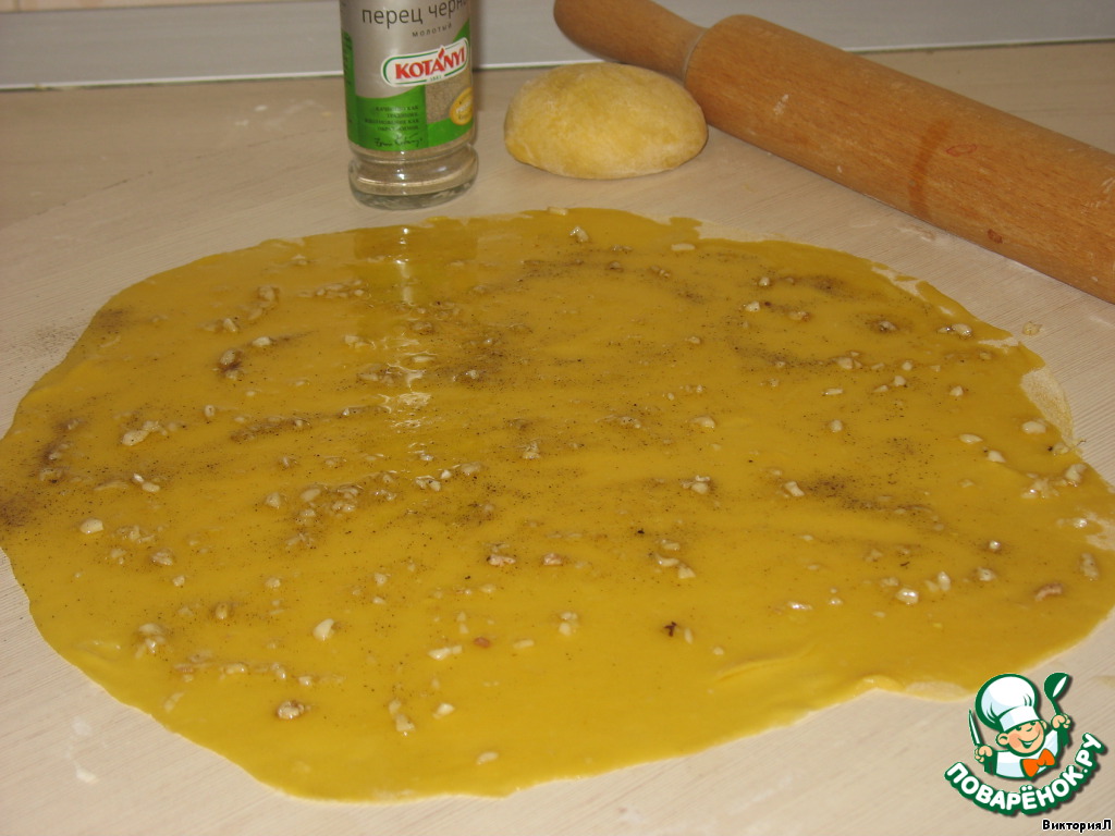 Из полученного теста раскатать две тонкие лепешки, толщиной примерно 1 мм, смазать маслом с чесноком, посыпать черным перцем и скрутить рулетики, защипав край, чтобы в процессе варки рулетики не раскрутились.