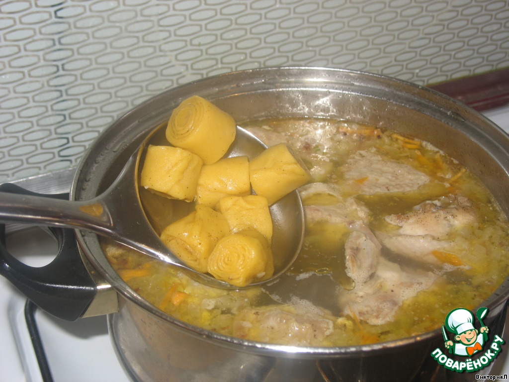 Когда курица в бульоне будет готова, опустить рулетики в бульон и варить еще минут пять.