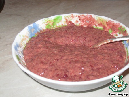 Перемолоть на мясорубке куриную печень с луком, добавить муку и специи.