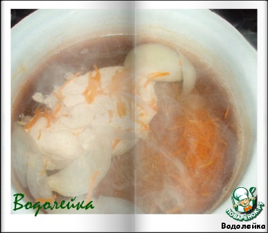 Первым делом варим куриный бульон. Так, как вы это делаете обычно. В него, естественно, добавляем лук и морковку. Ну, и соль по вкусу.