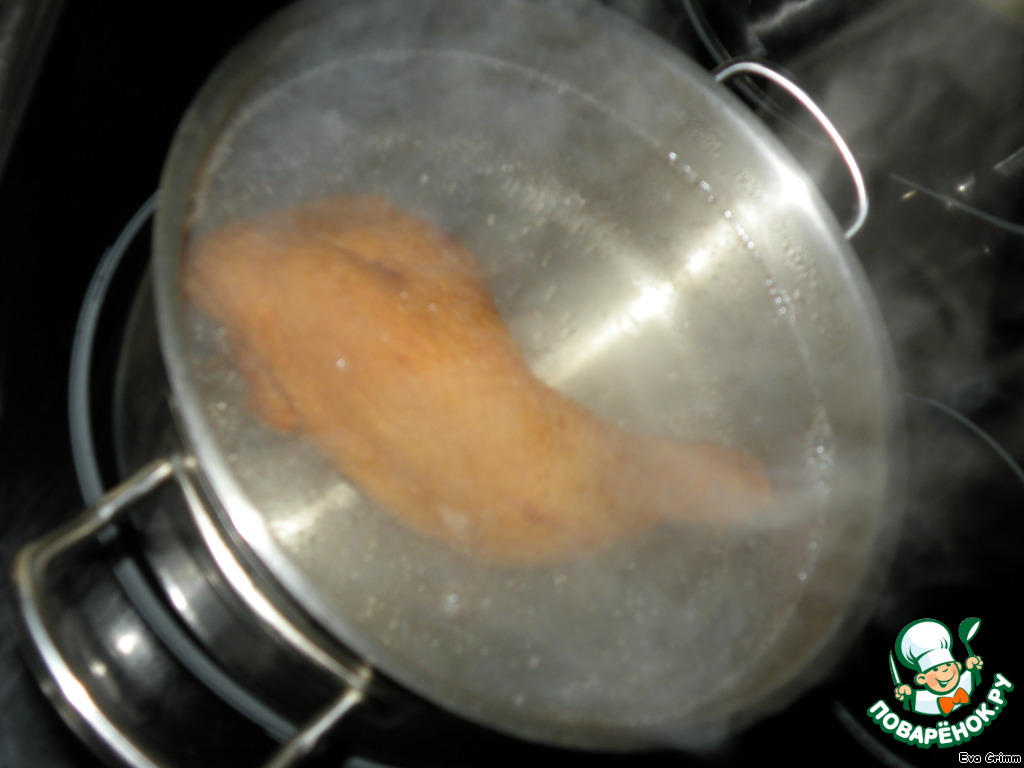 Итак, отварим курочку, я вывариваю ее довольно долго, чтобы мясо само от костей "отлетало" (мяско я кушала само по себе, в бульон его можно вернуть, но по желанию)